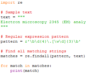 ================================================================================= Search/extract all the 4-digit numbers from a given text. Code: Output: =========================================== Search strings which contain 8 characters where there are 4-digit number in front of the dot "." and after the dot it can be any 3 characters (numbers, letters, or a mixture) after the dot. Code: