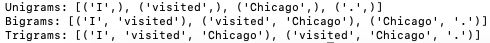 For instance, in a bigram model, we might calculate the probability of a word given its preceding word. In the example sentence "I visited Chicago," the bigram probabilities could help predict the likelihood of "visited" given "I" or "Chicago" given "visited." A simple Python code to generate n-grams (unigram, bigram and trigram) from a given text using NLTK is (code): The output of the code above is: In this example above, ngrams from NLTK is used to generate unigrams, bigrams, and trigrams from the input text. The word_tokenize function is used to tokenize the input text into words. ============================================