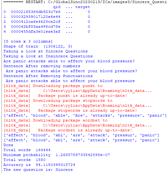 New Question Classification: Finally, the script allows you to input a new question, preprocess it in the same way as the training and test data, calculate the probability of it being insincere or sincere, and classify it accordingly.
