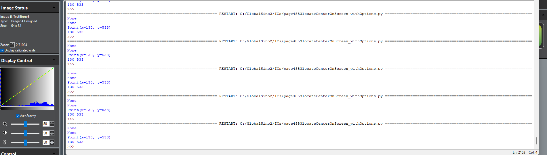 ================================================================================= Examples of parameters of .locateCenterOnScreen: region = (320, 860, 1320, 1075), grayscale = True, confidence = 0.8. ====================================================== Pyautogui uses screencaps to find the location of stuff on the screen. he problem on macs with a retina display is that the screen output have double the number of pixels, to take advantage of the system’s greater pixel density for a crisper image.Therefore, when you take a screenshot, you get an image containing double the number of pixels than the same image from a non-retina Mac locateCenterOnScreen can give wrong coordinatess because of the reasons below: ====================================================== Click the first match continuously: code: ====================================================== Click the link on a webpage with a similar feature: code: ====================================================== Exception for locateCenterOnScreen: code: ============================================ Load images and ColorMixing in DigitalMicrograph: code: ============================================ Locate center on screen by locateCenterOnScreen() with reference options: code: ============================================ Reverse function of locateCenterOnScreen(): code: