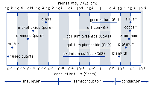 Typical range of conductivities for insulators, semiconductors, and conductors