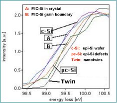 Reference: Compositional analysis of ultrathin silicon oxynitride gate dielectrics by quantitative electron energy loss spectroscopy, Heiko Stegmann and Ehrenfried Zschech, APPLIED PHYSICS LETTERS VOLUME 83, NUMBER 24, 5017 (2003). The Si L2,3 core-loss edge can be used to probe the crystal chemistry around Si, providing information on the s- and d-like partial density of unoccupied states of the Si-O bonds. Shift of ionization edge: In comparison with a bulk Si, this Si edge of GeSi is shifted more than 1 eV towards higher energies and has a different shape. Contact us: Feedback |